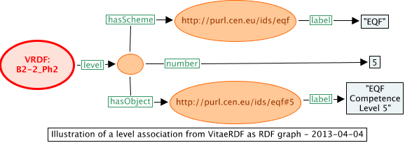 The overall "stages" of the VRDF do look as if they might be mapped to other level schemes. Though the Vitae RDF doesn't actually do this, one could speculate that Phase 2 of "Commitment to research" might be associated with EQF level 5. It is not clear whether all the descriptors for the same phase belong to the same EQF level. If they did, there would be a case for making more of the Phases as substantive entities; making them into LOC definitions in their own right, as is done in the e-CF example, given with the XML binding.