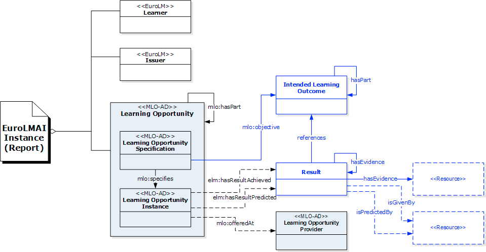 EuroLMAI contains many MLO elements. EuroLMAI also represents results for assessments on these learning outcomes, and possibly also evidence that supports that assessment. This is shown in this diagram taken from the EuroLMAI project output on intended learning outcomes