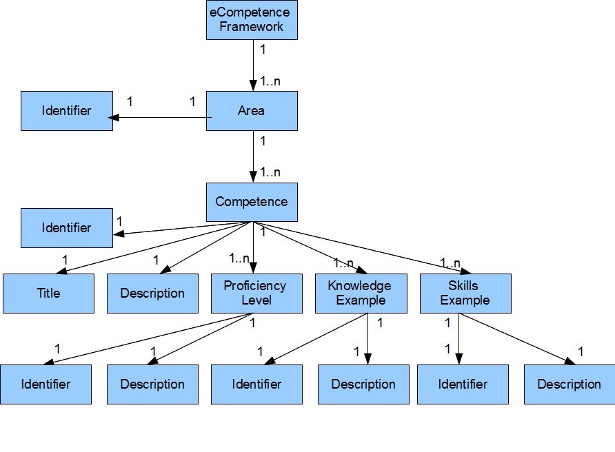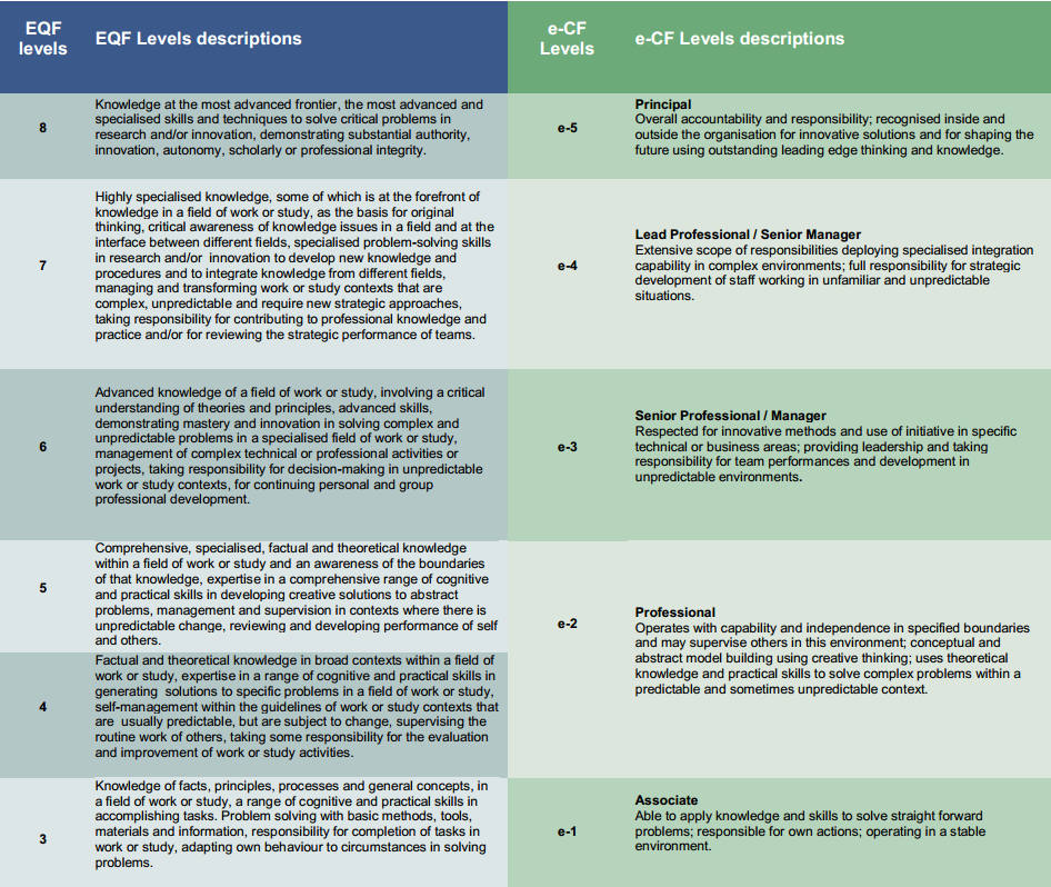 - e-Competence Framework follows a certain schema of proficiency levels which are defined in eCF, and are referenced to EQF. Each competence has particular proficiency level attributed.