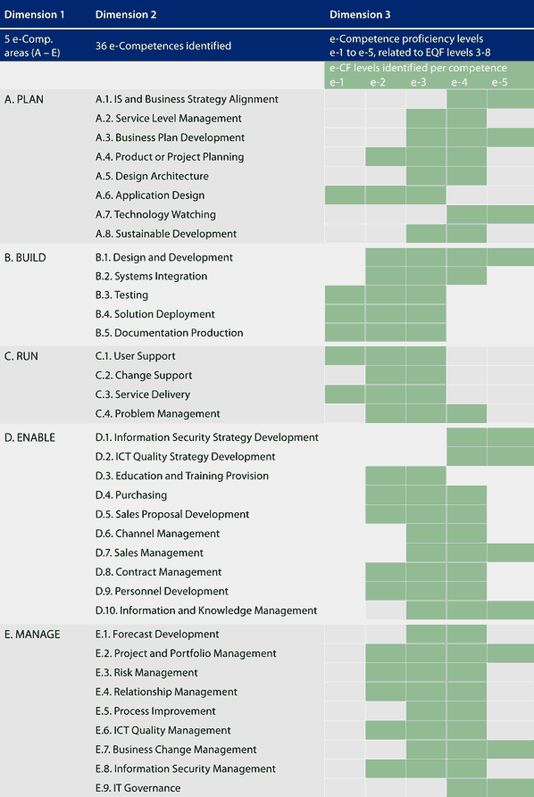 The e-CF has the competences defined in the form of dimensions. (See the overview). Dimension 1 is e-Competence Area which consists of e-Competences (Dimension 2). Each e-Competence has 5 proficiency levels (Dimension 3).