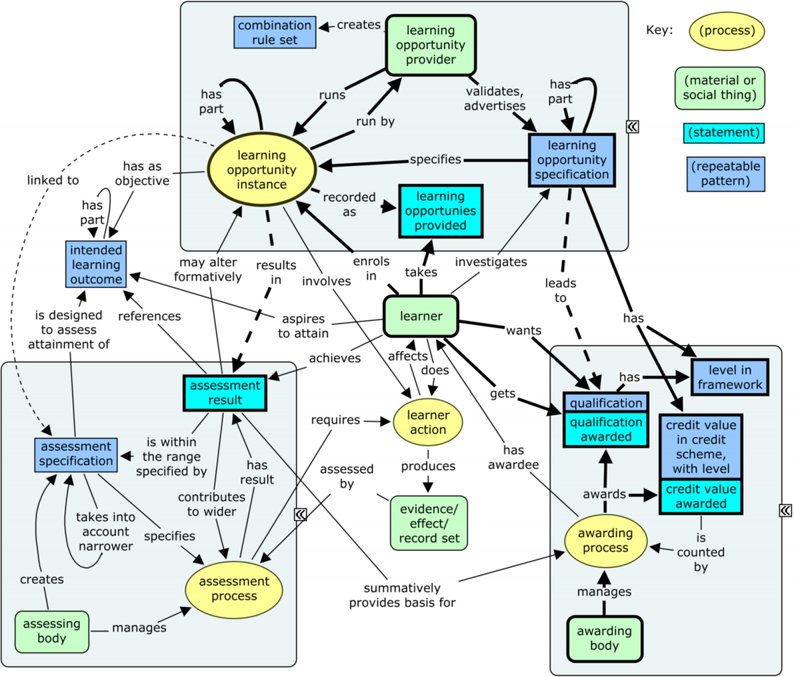 All processes are here shown as ovals. The learning opportunity instance is the course, etc., in which organised or formal learning takes place. This involves some action by the learner. The assessment process also requires learner action. The assessment process assesses the evidence, and produces assessment results. In the awarding process, those results are used as the basis for awarding credit or qualifications.