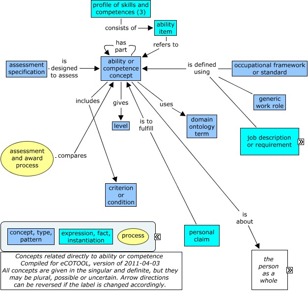 Apart from the use in the ECS Section 3, the maps indicate that ability or competence concepts can be used: (a) in assessment, in the sense that an assessment is designed to assess a person’s ability or competence in the given area, and the assessment process compares the evidence of a person’s activity with the concepts; (b) in personal claims; (c) in job descriptions or requirements; and (d) in occupational frameworks or standards (which themselves may mention generic work roles). Not illustrated in the maps is their potential use (e) in courses of learning, education or training.