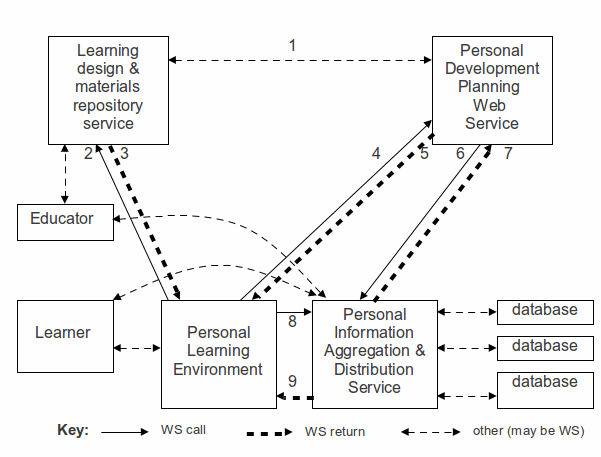 As an alternative kind of example, we can look at the scenario envisaged for reflective learning and personal theory building. Learners currently use PDP systems directly for making learning logs, planning, and finding skill development resources. In this future scenario, the PLE would be acting primarily as a front-end to the PDPWS and the PIADS.