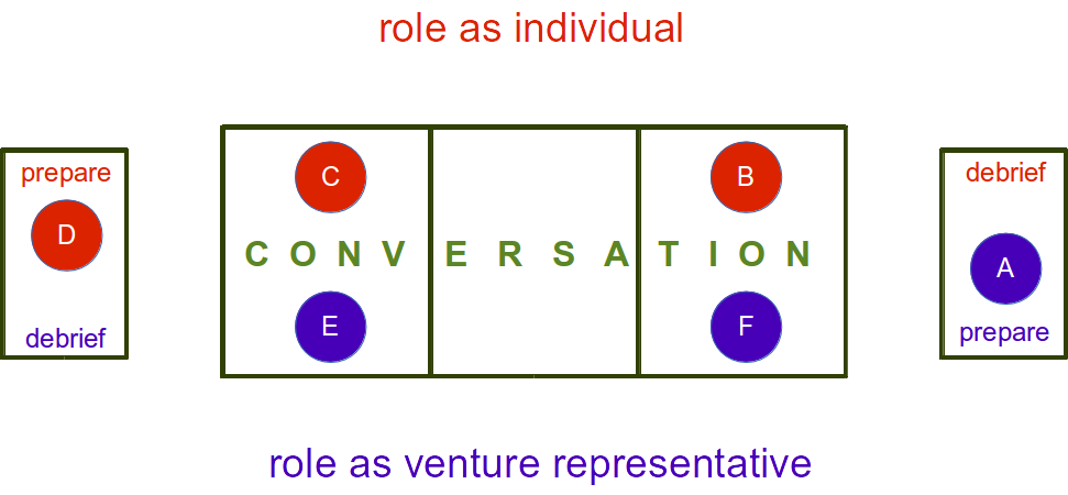 Now B as an individual has a conversation with F holding the initiative role, and C talks with E. A is preparing for the initiative role; D is preparing for the individual role.