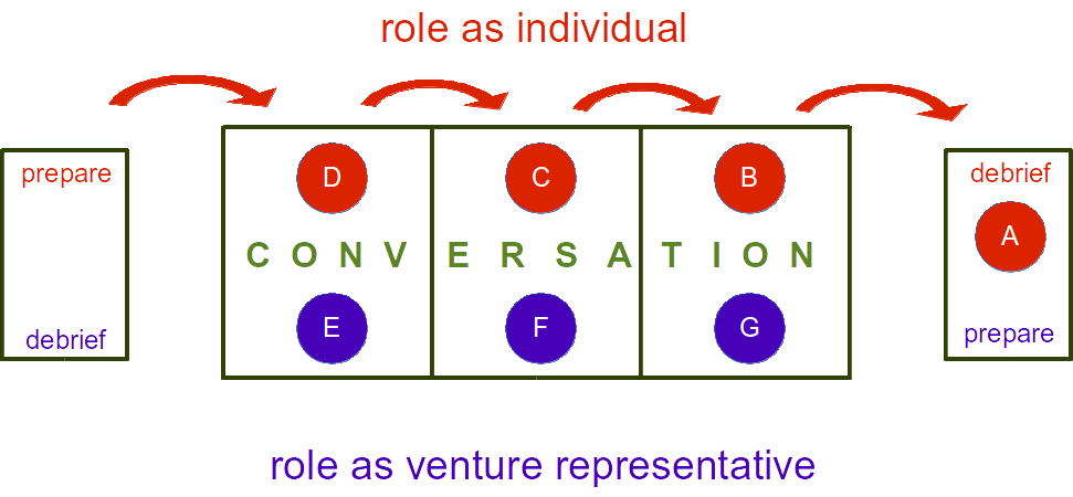 After the first set of conversations, four people move and three stay where they are. A debriefs from the role of individual.