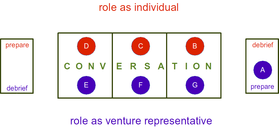 Next, B as individual has a conversation with G holding the initiative role, and similarly C talks with F and D with E. A prepares to take on the initiative role.