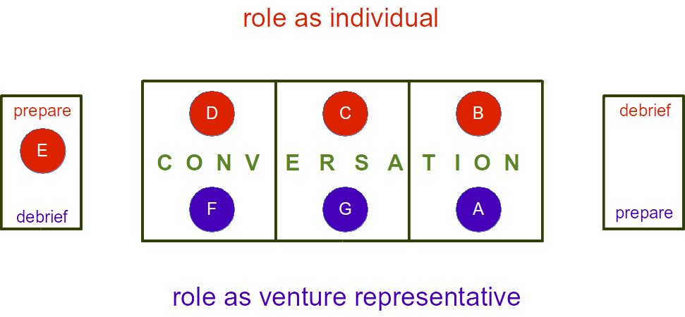 The third set of conversations has A representing the initiative, talking with B as individual, G talking with C and F with D. Meanwhile, E is preparing for the individual role.