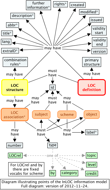Figure 13: The InLOC model completed with all the direct properties. Note that in this and similar diagrams, a '*' following an element name indicates that the element may be repeated.