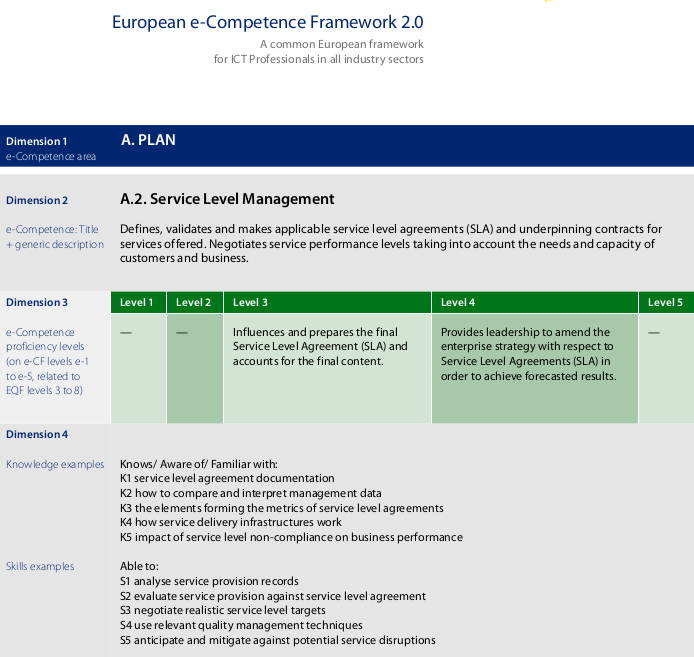 - The e-CF e-Competences are regarded as LOCdefinitions. Taking the example here, A.2, individuals may be asked about their abilities in "Service Level Management". They might answer in terms of the extent of their experience and their proficiency level.