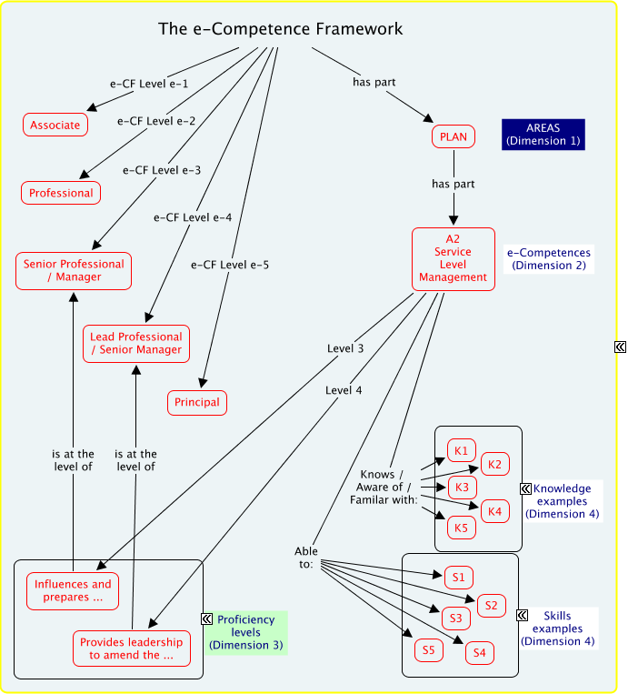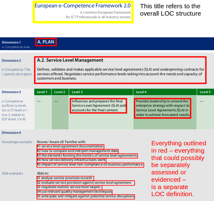 According to this definition, Figure 2, above, shows the LOC definitions on the A.2 page. Each one of the red rectangles contains the definition of a single concept, different from every other concept on this page, for which some sort of evidence could be provided for a particular person. The top red-outlined concept, "PLAN", in the context of ICT systems is very broad and quite vague, and what evidence would count towards verifying someone's competence at planning, in an ICT context, may only be vaguely defined. The e-CF clarifies this by breaking it down into 8 "e-Competences" (A.1 to A.8). (Other frameworks or analyses may of course differ in their analysis.) Below the e-CF's general area heading, "PLAN", it becomes increasingly easy to imagine producing evidence for a person's ability for the LOC definitions, and to imagine appropriate assessment.