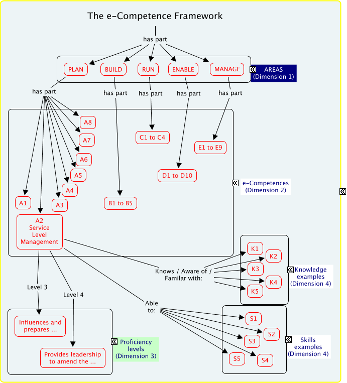 Figure 3: diagram showing the parts of the e-CF (a full diagram would include similar breakdowns of all the 36 "e-Competences", with their examples and their levels).