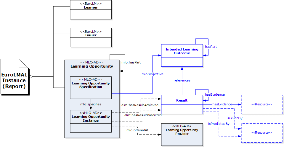 EuroLMAI contains many MLO elements. EuroLMAI also represents results for assessments on these learning outcomes, and possibly also evidence that supports that assessment. This is shown in this diagram taken from the EuroLMAI project output on intended learning outcomes