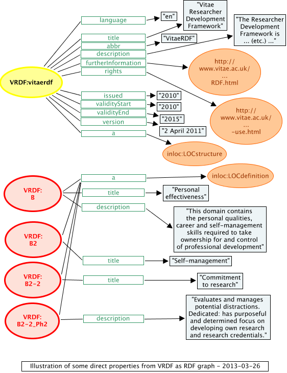 The overall "stages" of the VRDF do look as if they might be mapped to other level schemes. Though the Vitae RDF doesn't actually do this, one could speculate that Phase 2 of "Commitment to research" might be associated with EQF level 5. It is not clear whether all the descriptors for the same phase belong to the same EQF level. If they did, there would be a case for making more of the Phases as substantive entities; making them into LOC definitions in their own right, as is done in the e-CF example, given with the XML binding.