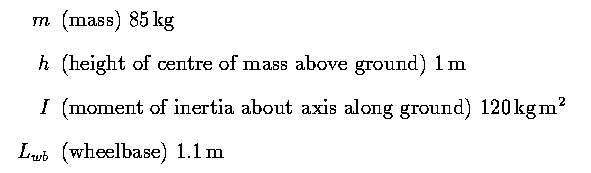 The technical difficulties of studying real bicycle control put it out of experimental reach of a project such as the current one, perhaps further out of reach than the study of real maritime collision avoidance, discussed above (§3.1). The alternative was to create a bicycle-like simulation, using the computer equipment available. The author had a reasonable understanding of the fundamental physics involved in bicycle dynamics, but did not feel confident to start modelling the finer points such as the gyroscopic effects of the wheels. To distinguish this model from a high-fidelity mathematical model, it was decided to call it the Simple Unstable Vehicle, or SUV for short.