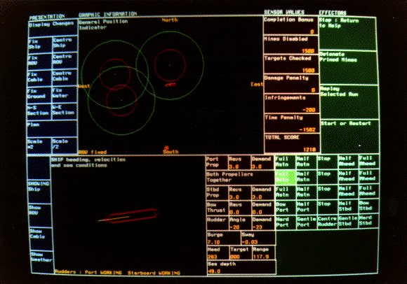 The highest-level divisions apparent were between the different objects of the simulation: the ship, the ROV, and the umbilical cable. It was therefore decided to divide the screen horizontally into two parts, one of which would show information relevant to the task as a whole, or all the objects of the task, and the other would show sensors and effectors either for the ship, or for the ROV, or for the cable. The resultant appearance of the interface is shown in Figure 6.1, with the ship sub-display showing.
