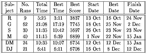 Table 6.1: Subjects' times, scores, and dates (1989–90)