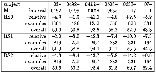 There are two trends immediately apparent in this table. One is that RS1 and RS2 perform substantially better than RS0, with RS2 being slightly the better of the two. The other is that whatever rules were induced for the interval 05 were not much in evidence during interval 02, and progressively became more so. This is reassuring in two ways: firstly it suggests that the rules found are not imaginary, or due to random effects; and secondly that these rules are being adopted increasingly as time goes on. This is consistent with a common-sense view of learning.