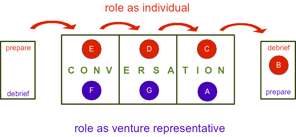 The pattern of changing places and holding conversations repeats until everyone has talked with everyone else, both ways round.